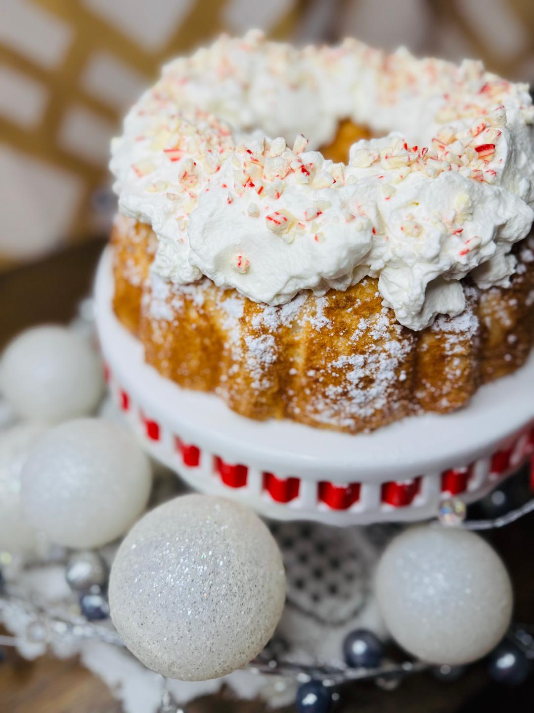 “A Christmas Angel Match” on Hallmark Channel was full of heavenly delight! I loved Benjamin Ayres and Meghan Ory as the match making angels that they were. And what better way to end the movie than with the two matchmakers becoming a match themselves! The all white attire, and setting up in the clouds was done very well and really set the tone for these character’s roles. I wanted to make something light and fluffy just like the clouds these characters resided in. No better heavenly treat than angel food cake! With a Christmas twist of course!