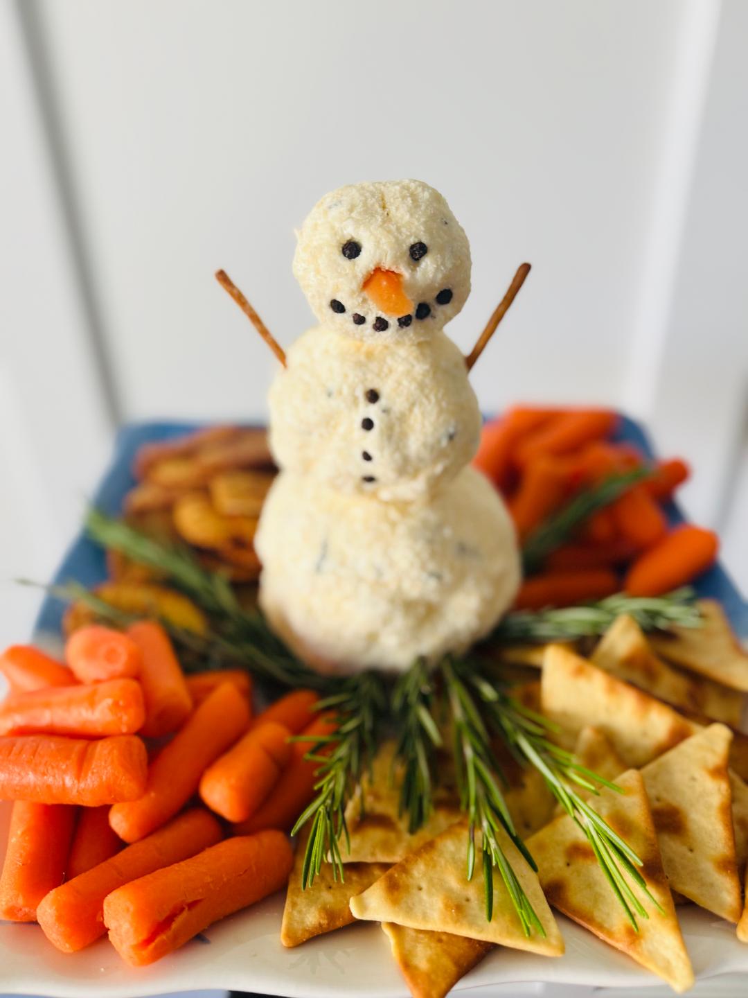 When ready to serve, add your crackers and carrots around the snowman on the platter for dipping. Enjoy!