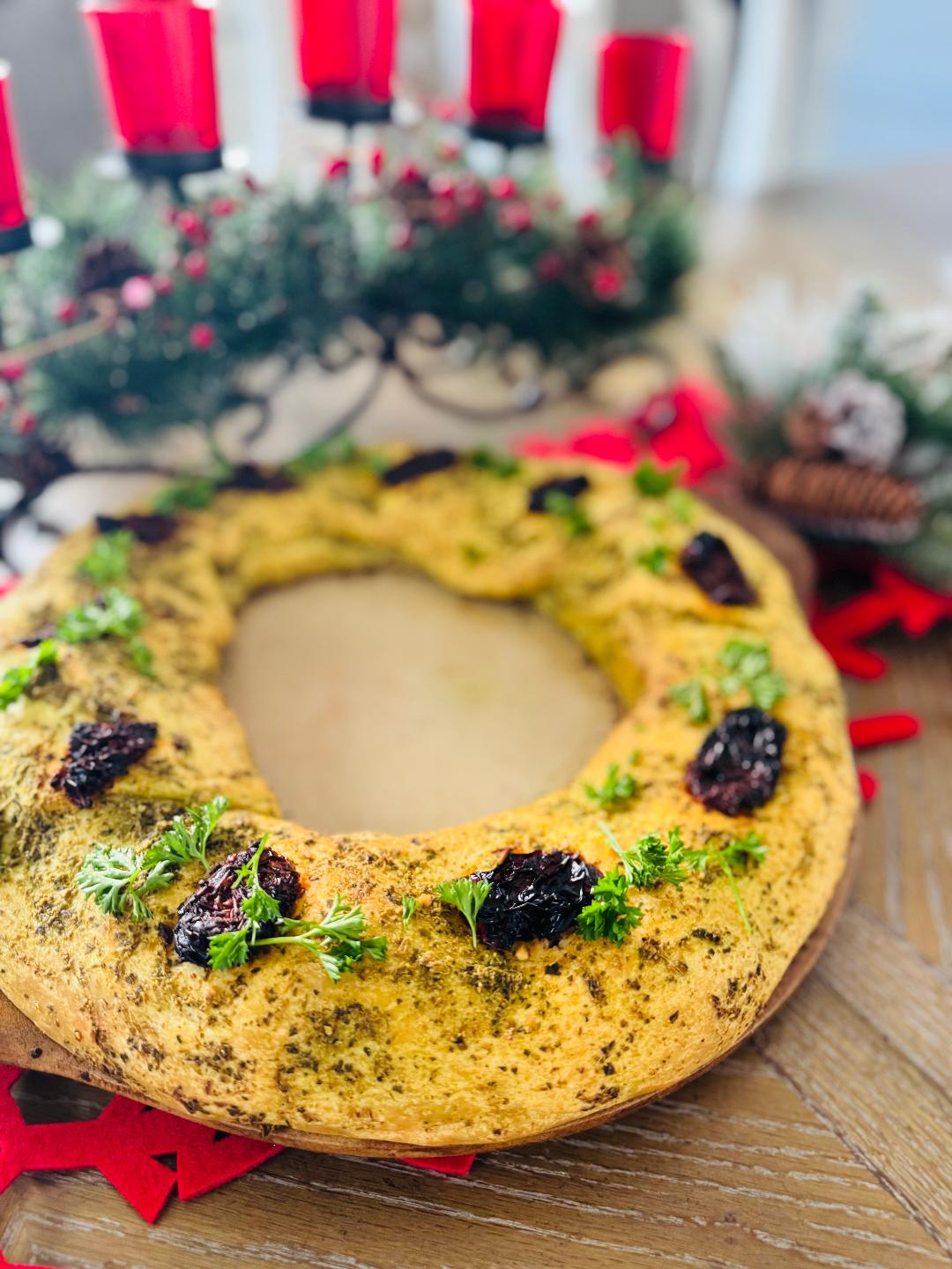 Using a basting brush, baste on the pesto all over the entire dough wreath. Place remaining sun dried tomatoes as ornaments along the top after that.