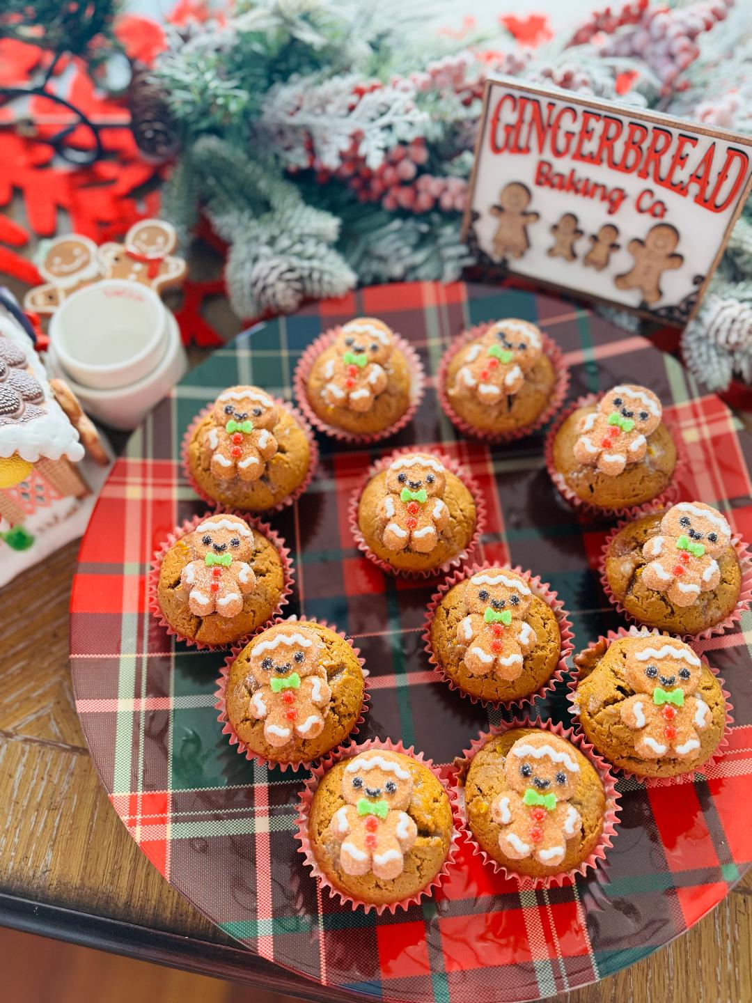 The group of potential leading men in Hallmark Channel series, “Finding Mr. Christmas” was a fun one this week! Not only did the guys become cowboys in a scene with Hallmark star Allison Sweeney, they also built gingerbread houses that were to reflect themselves and their lives. They were so cute and festive! These gingerbread muffins are for these studs!